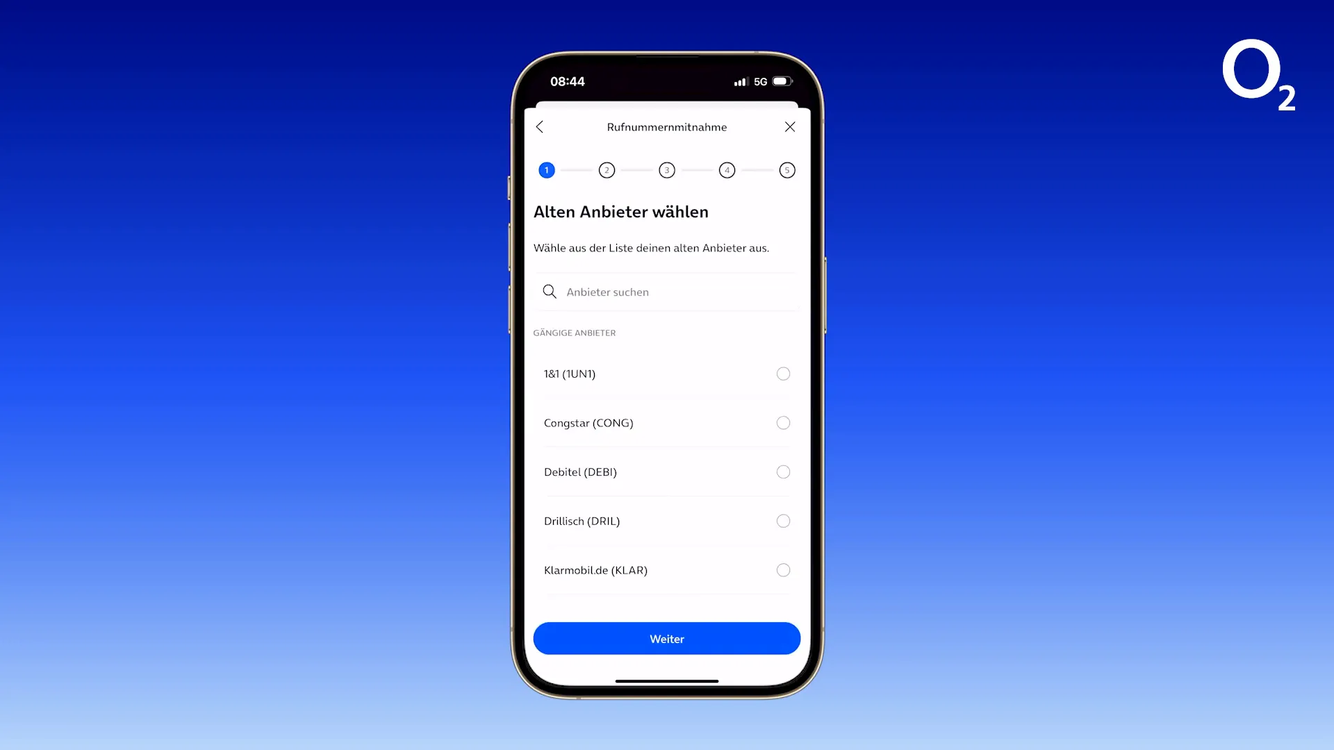 Nachdem Du alle erforderlichen Informationen eingegeben hast, kannst Du mithilfe der Suchfunktion nach Deinem alten Anbieter suchen oder ihn in der Liste direkt anwählen. Tippe nach erfolgreicher Auswahl auf ‚weiter‘.