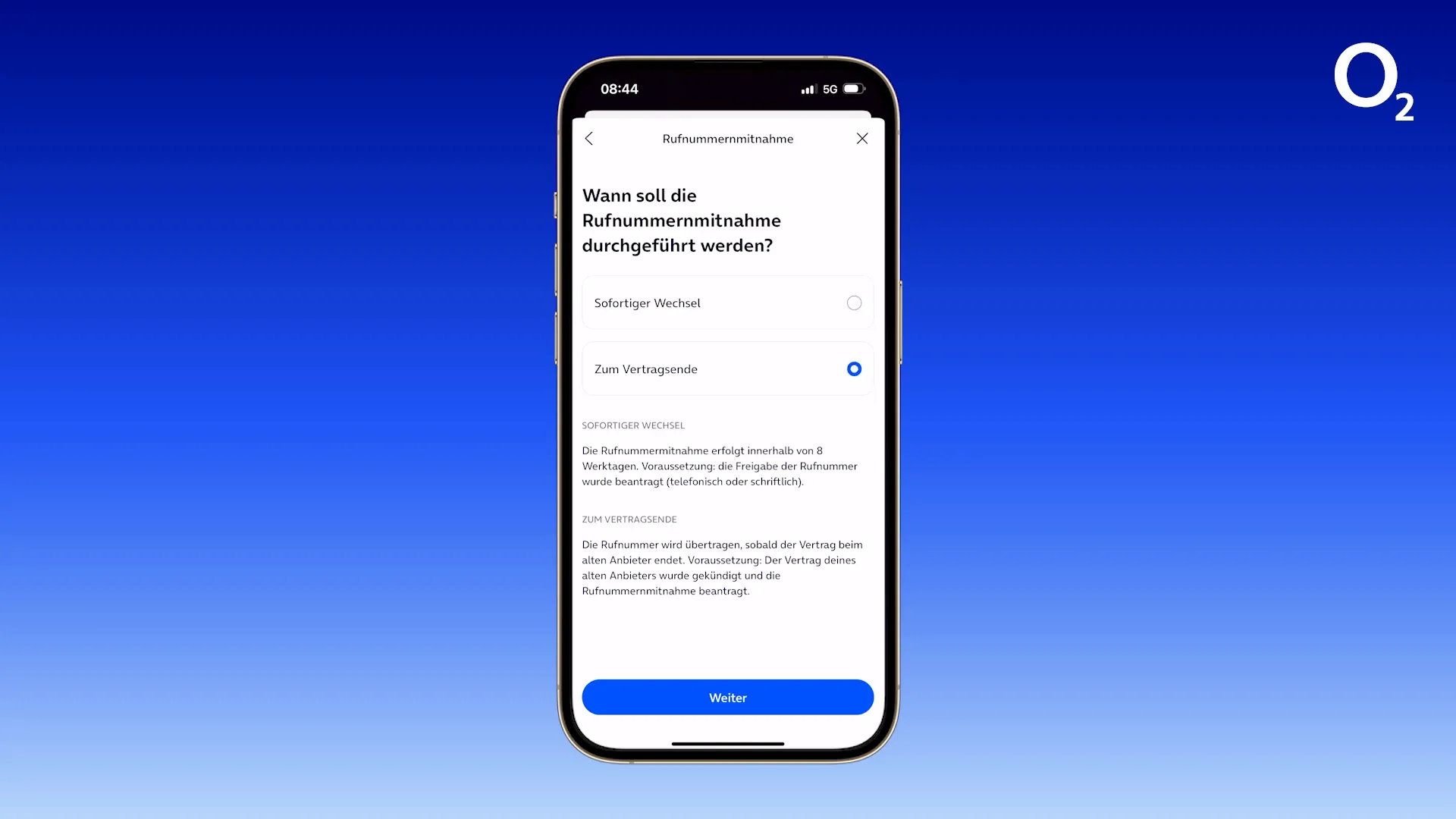 Nun kannst Du wählen, ob die Rufnummernübertragung schnellstmöglich oder erst zum Vertragsende Deines alten Vertrages erfolgen soll. Wähle die für Dich passende Option und tippe auf ‚weiter‘.